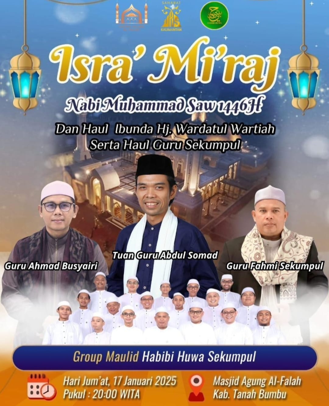 NEWSTUNTASP.COM, TANAHBUMBU – uluhan ribu jamaaah hadiri Isra Muhammad SAW dan Haul Tuan Guru H Muhammad Zaini bin Abdul Ghani Sekumpul serta haul Hj Wardatul Wartiah binti H Abdul Samad atau ibunda H Syamsuddin Andi Arsyad dikenal Haji Isam, di Masjid  Agung Al Falah, Desa Gunung Antasari, Kecamatan Simpang Empat Kabupaten Tanahbumbu, Jum’at (17/1/2025).