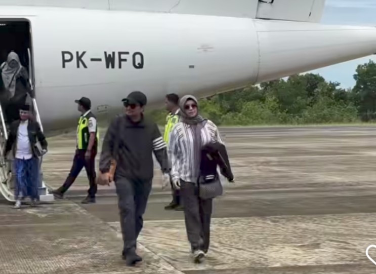 Mengenakan jaket dan topi warna hitam didampingi istri tercintanya, tiba di Bandara Sujud, dan disambut langsung oleh Bupati Tanahbumbu Andi Rudi Latif.